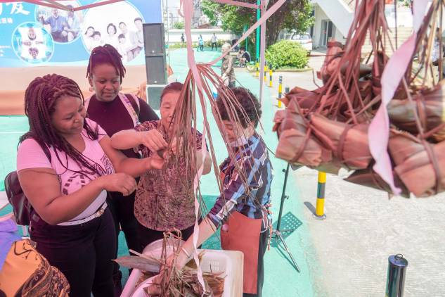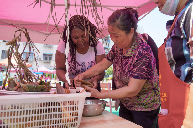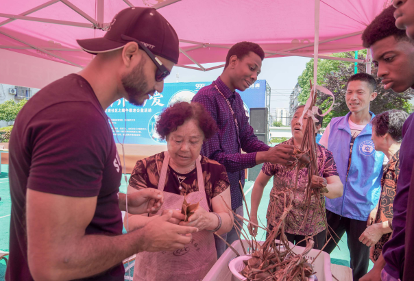 活动中,在老人们的帮助下,外国友人们像模像样地包起了传统四角粽包。活动现场还开展了文艺汇演、篮球比赛、书法学习等各式各样的文体活动。不少留学生表示,在温州生活学习多年,非常喜欢体验中国传统文化和生活习俗。