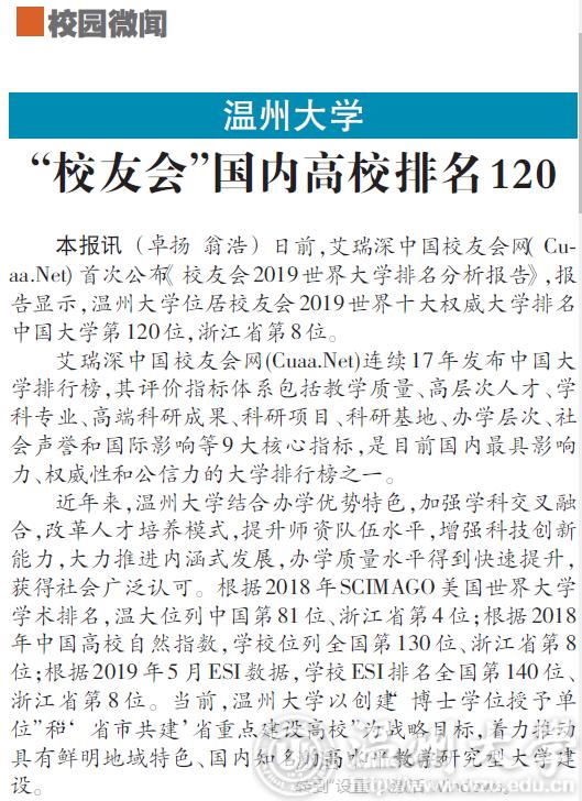 本报讯(卓扬 翁浩)日前,艾瑞深中国校友会网(Cu0aa.Net)首次公布《校友会2019世界大学排名分析报告》,报告显示,日本色情片 位居校友会2019世界十大权威大学排名中国大学第120位,浙江省第8位。