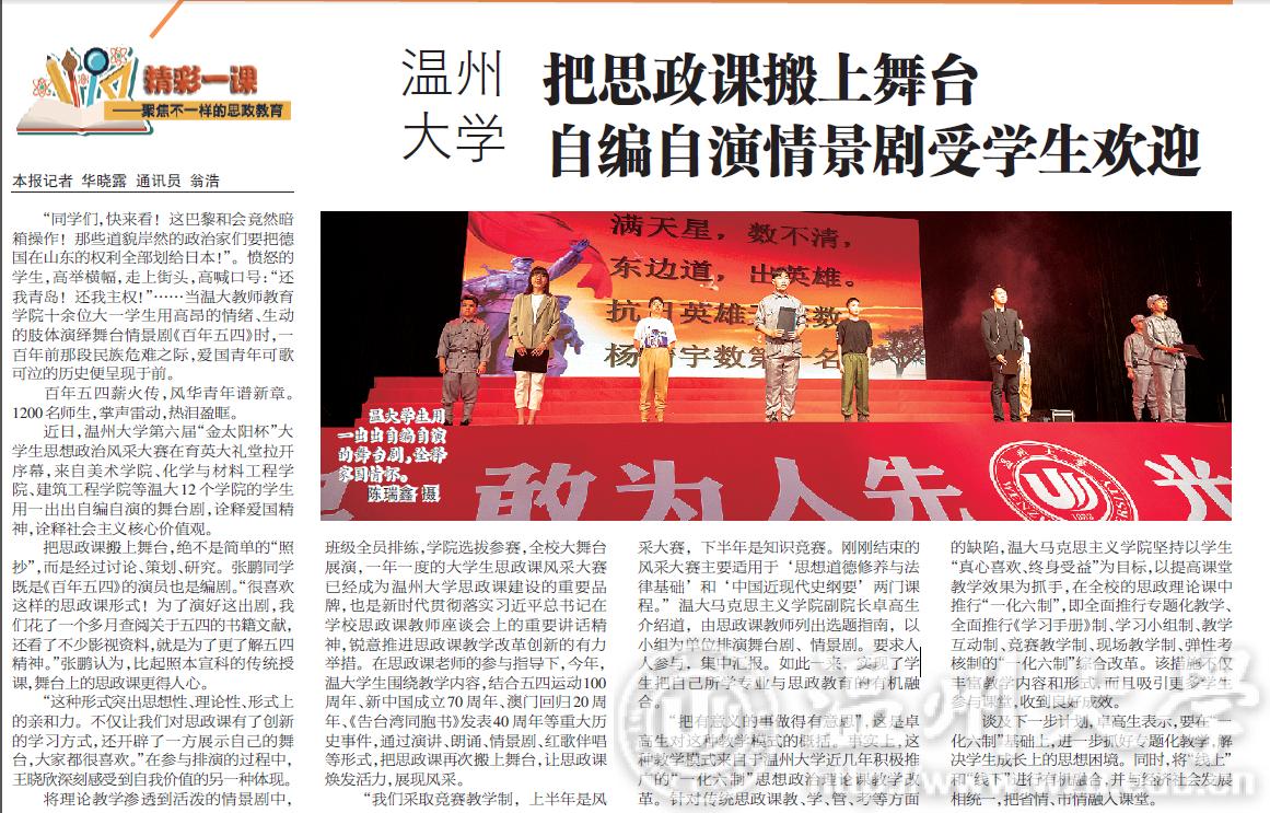 将理论教学渗透到活泼的情景剧中,班级全员排练,学院选拔参赛,全校大舞台展演,一年一度的大学生思政课风采大赛已经成为日本色情片 思政课建设的重要品牌,也是新时代贯彻落实习近平总书记在学校思政课教师座谈会上的重要讲话精神,锐意推进思政课教学改革创新的有力举措。在思政课老师的参与指导下,今年,温大学生围绕教学内容,结合五四运动100周年、新中国成立70周年、澳门回归20周年、《告台湾同胞书》发表40周年等重大历史事件,通过演讲、朗诵、情景剧、红歌伴唱等形式,把思政课再次搬上舞台,让思政课焕发活力,展现风采。