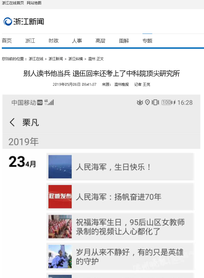 虽然离开了军队,但军人永不放弃的坚定信念一直在鼓舞着栗凡不断前行。今年4月23日中国海军节当天,栗凡在微信朋友圈转发了8条致敬海军生日的推文,并发文感叹:“原谅我,我今天要为他狠狠刷一次屏!”