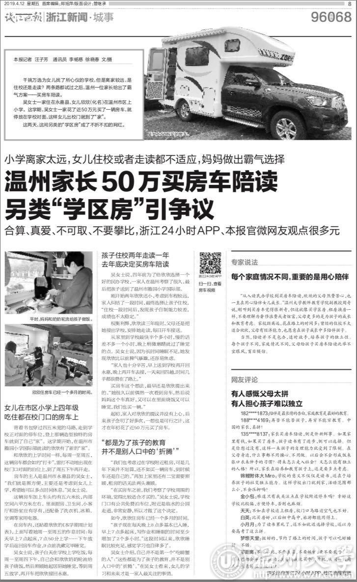 千挑万选为女儿找了所心仪的学校,但是离家较远,是住校还是走读?两条路都试过之后,温州一位家长给出了霸气方案——买房车陪读。吴女士一家住在永嘉县,女儿欣欣(化名)在温州市区上小学。这学期,吴女士一家花了近50万元买了一辆房车,就停放在学校对面,这样女儿出校门就到了“家”。这两天,这间另类的“学区房”成了不折不扣的网红。