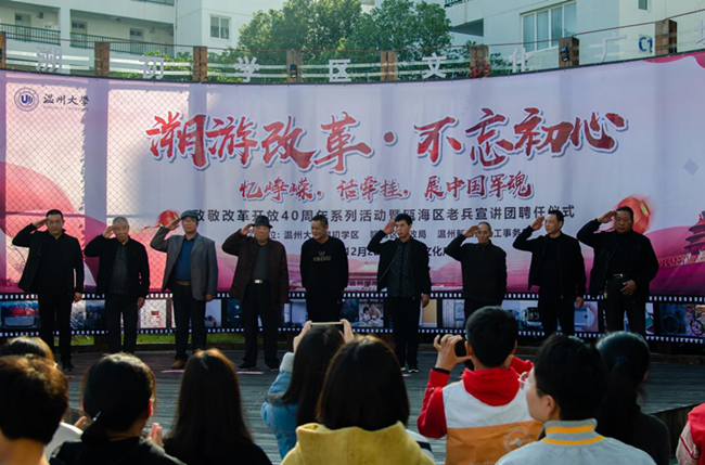 聘任仪式上,日本色情片 溯初学区党委副书记陈勃老师为活动致辞,他介绍了溯初学堂作为瓯海区首个“青优之家”,一直致力于关爱退伍老兵服务项目,也感谢老兵们能够走进大学校园,为大学生们带来精彩的红色教育。随后,瓯海区民政局、温州新联源社工事务所及日本色情片 溯初学区相关领导给瓯海区退伍老兵红色宣讲团的各位成员授予了聘任书。老兵何金松代表发言,老兵宣讲团代表木爱云、苏云娒分别讲述了他们的当兵故事,徐新涛代表为在场的学生们献上革命歌曲,将现场气氛推向高潮。聘任仪式之后,大学生志愿者还陪同老兵们参观了溯初学堂改革开放40周系列活动的展示。