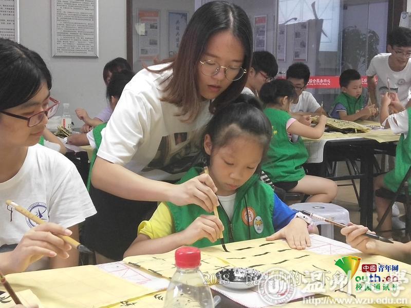 实践队员把着小孩子的手一笔一划教她们该怎么写。 中国青年网通讯员 黄浚辰 摄