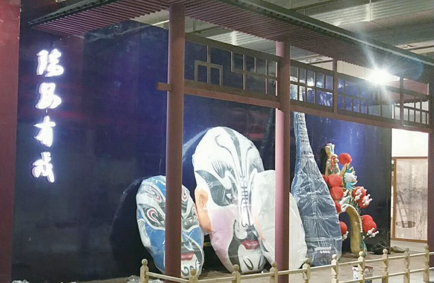 一张大大的脸谱的背后就是“瑞安有戏”主题馆了。整个展馆以南戏鼻祖瑞安人高则诚创作的南戏经典《琵琶记》为中心,将南戏昆曲当中常用的黑(正直)红(英勇)蓝(刚强)金(神圣)这四款颜色作为场馆的主题色,用色大胆。