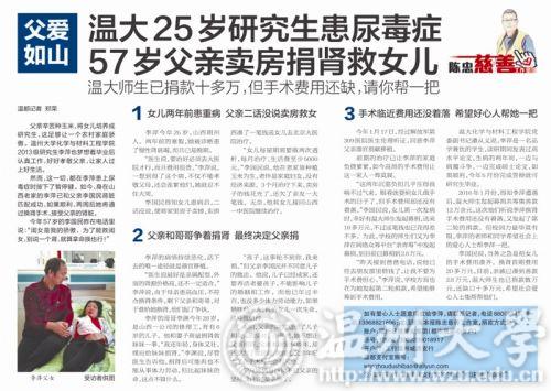 李萍是温大化学与材料工程学院2013级研究生,一切顺利的话,几个月后她将要回温参加研究生毕业论文答辩。李萍说,毕业参加工作的第一件事情,就是赚钱给父母买房。为给她治病,父亲把老家的房子都卖了。
