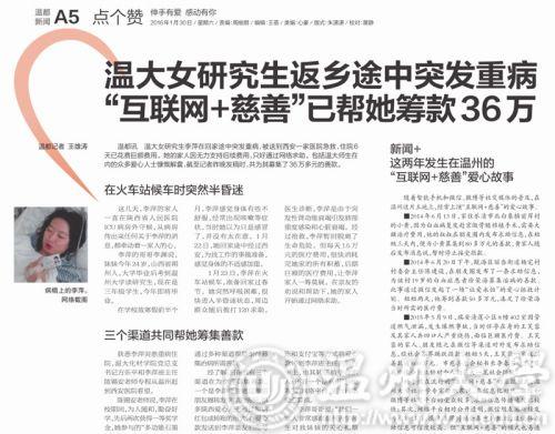 今年1月份,本报连续报道李萍患病的情况,引起了社会各界的关注,温州都市报陈忠慈善工作室爱心账户募集到13万余元善款,温都记者昨天中午在医院为李萍办理了爱心捐款的申领手续。此外,温大师生、校友捐款6万余元,瓯海区慈善总会捐了3万元。温大离休干部李方华的3万元捐款近期也将转账给李萍。