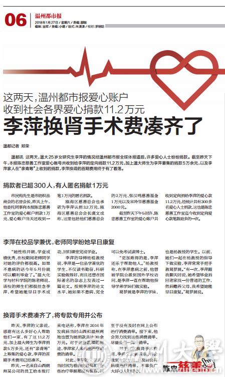 这两天,温大25岁女研究生李萍的情况经温州都市报全媒体报道后,许多爱心人士纷纷捐款。截至昨天下午,本报陈忠慈善工作室爱心账号共收到给李萍的定向捐款11.2万元,加上温大师生为李萍募集的捐款5万余元,以及李萍家人在“亲青筹”上收到的捐款,李萍换肾的首期费用终于有了着落。