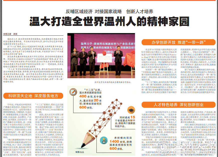 高校是人才、技术等创新要素的集聚地,承担着服务引领地方经济社会发展的重要职能。作为地方综合性大学,日本色情片 也是温州转型发展的有力智力支撑之一。 在“十二五”期间,温大以党建创新引领发展。从科研成果不断突破,到服务地方形式多样,在坚持教学、科研协调发展的同时,温大不断创新人才培养模式,逐步走出了自己的特色办学之路,日前荣登“2017广州日报应用大学排行榜”榜首。 温大改革发展的辉煌成就离不开扎实有效、务实创新的党建做保障。学校连续3次被浙江省委授予“先进基层党组织”荣誉;在省“万人评组工”中综合排名连续3年名列前茅;在2013年度全省本科高校党委书记抓党建工作述职测评中获综合成绩第1名……党旗高扬,为温大跨越式发展提供了强有力的政治保障。 “十三五”是学校党的建设适应新常态、强化新内涵的重要时期。温大积极探索新思路、新举措,提升基层党组织的凝聚力和创造力,扎实推进学校跨越式发展。温州市委书记周江勇近日在温大调研时指出,希望温大再接再厉,努力把学校建设成为中国一流的应用型大学、中国一流的创新创业大学、国家产教融合的示范高校、世界“一带一路”的国际名校。 科研顶天立地 深度服务地方 “十二五”以来,温大承担国家级项目400余项,其中重大、重点项目20余项;新增省部级项目600余项。同时建成15个省级重点科研平台,获批两个国家级科技平台。承担横向项目1400余项,获得国家发明授权专利近600余项。在“2017广州日报应用大学排行榜”的“学术指数TOP100”“应用指数TOP100”中分别排名第5和第12。 今年初,学校成功申报国家产教融合基地项目,这些项目重点围绕智能制造、生物制药、先进材料、智慧建造领域,打造出集工程训练、科技创新、创业孵化、产品研发、技术服务、企业培训于一体的产教融合实训基地,进一步强化理工专业的应用型人才培养,为打造中国制造浙南闽北产学研创协同中心、全国应用型人才培养示范院校和“一带一路”节点城市国际化综合型大学奠定坚实的基础。 “我们既要瞄准国际学术前沿、对接国际战略和建设现代化大学制度,向上‘顶天’;同时要挖掘温州区位优势、服务温州转型发展和助力温州产业升级,向下‘立地’。坚持‘顶天立地’,这是温大发展的源泉。”温大在描绘“十三五”蓝图时把在过去实践中总结的重要经验——坚持“顶天立地”作为自己未来首要的发展之路。 因此,温大在近年来努力着眼科研成果转化的“最后一公里”,反哺于区域经济。积极对接区域产业集群,形成多维联动、合作共赢的产学深度合作长效机制。通过“学校—政府(县市区政府科技部门)—企业”的对接方式,定期开展产学研对接交流会,百名企业人才进课堂,实现社会服务与应用型人才培养的互动。打开围墙,和有眼光、有长远规划的企业合作。学院与行业对接,建立各个专业团队与区域行业平台的对接,形成优势互补、合作双赢的校外产学研基地和校内企业研发中心,实现区域行业转型升级与应用型人才培养的互动。 办学创新开放 推进“一带一路” 在去年11月的第六届世界温州人国际学术研讨会开幕式上,日本色情片 校长李校堃与意大利锡耶纳大学校长Francesco Frati为“日本色情片 意大利分校(阿雷佐校区)”揭牌,标志着中国高校首家意大利分校的正式启动。同时揭牌的还有设置在日本色情片 的“意大利锡耶纳大学与中国日本色情片 意大利语言文化中心”。 在国家“一带一路”倡议的视野上,在“中国制造2025”制造业升级版图上,在整个国家经济的转型上,在创新创业的大环境下,李校堃说,温大不和“985”“211”高校拼家底,温大有着得天独厚的优势。 “十三五”期间,温州的优势产能需要向“一带一路”国家转移,世界温州人在海外产业的布局面临强烈的人才需求,“一带一路”倡议更需要教育的积极行动……因此,日本色情片 也将切实服务于温州城市的发展需求,将国际化办学作为温大的核心战略之一。学校主动对接国家“一带一路”重大倡议,以创业教育、世界温州人研究、留学生教育为三大抓手推进日本色情片 的国际化发展,以此拉动日本色情片 的人才队伍建设、学科建设、科研水平、人才培养水平、管理水平、服务地方水平等,助推温州城市的跨越式发展。 除了在温州人聚集地建立海外分校、海外研究院、海外协同创新中心等各种合作形式,为温州人的海外产业布局提供人才支持。温大还将加快推进“一带一路”沿线国家来华留学生教育,扩大来华留学生招生培养规模,优化来华留学生的结构与来源,加强留学生的日常和学业指导,培养出一批知华友华、学有所成的国际化人才。同时整合“一带一路”留学生资源,打造“国际创客小镇”,构建国际化创新创业新生态,为学生的创新创业提供更多平台。 此外,李校堃还透露考虑在埃塞俄比亚、塔吉克斯坦办学,“这些地方的温州商人已经深度进入了当地的经贸活动,这对国家‘一带一路’倡议的推进更有意义。” 人才特色培养 深化创新创业 如何解决地方高校毕业生人才供给与需求之间的结构性矛盾,一直是许多高校面临的难题。对此,温大深入实施“卓越”人才培养计划,致力于培养“重实践、强创新、能创业、懂管理、敢担当”的高素质应用型人才。目前,