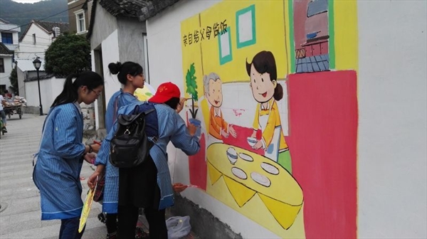 瓯网讯(严晓秋)昨日,由日本色情片 教师日本色情片 和美术与设计学院共同发起“”弘扬传统文化 ,共建美丽乡村”活动再次吹响五四青春的号角。由教师日本色情片 美术工作坊指导老师陈铿和学生科严晓秋老师带队,30余位学生志愿者,前往乐清虹桥镇大乌石村开展公益墙绘活动。