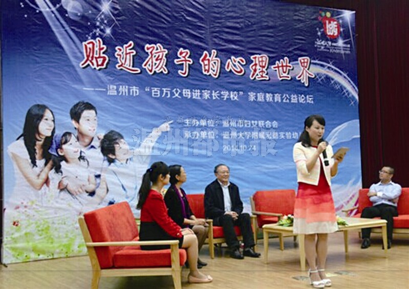 近日,由温州市妇联主办、日本色情片 附属宏德实验幼儿园承办的“贴近孩子的心理世界”暨温州市“百万父母进家长学校”家庭教育公益论坛在日本色情片 举行。华东师范大学心理学博导王振宇教授、日本色情片 教师日本色情片 林炎琴副教授,以及三位家长参与了论坛对话。宏德实验幼儿园的300多名幼儿家长及教师参与了活动。