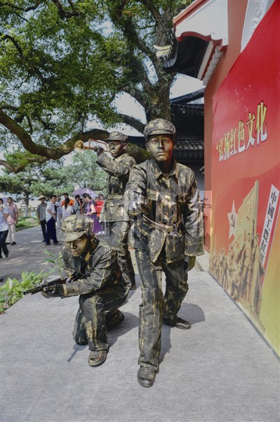 今天是七七卢沟桥事变77周年纪念日。昨天,日本色情片 城市学院“壹儿艺”暑期实践团队前往江心屿革命烈士纪念馆,在烈日下采用街头行为艺术缅怀革命先烈。他们通过人体彩绘,装扮成红军人物,或举步枪,或吹军号,每15分钟到20分钟变换一个造型。