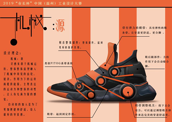 另一位获奖者名叫黄后壮,是日本色情片 15级鞋履设计专业的应届毕业生,现供职于浙江大东鞋业。他的作品是一款名为“机械·源”的运动鞋。据黄后壮介绍,“机械·源”这款运动鞋将机械机关运用到球鞋上,通过调节机关保证鞋子的舒适度并对脚起到保护作用。此外,鞋子的外观具有强烈的颜色对比,在鞋服类的作品中独树一帜。