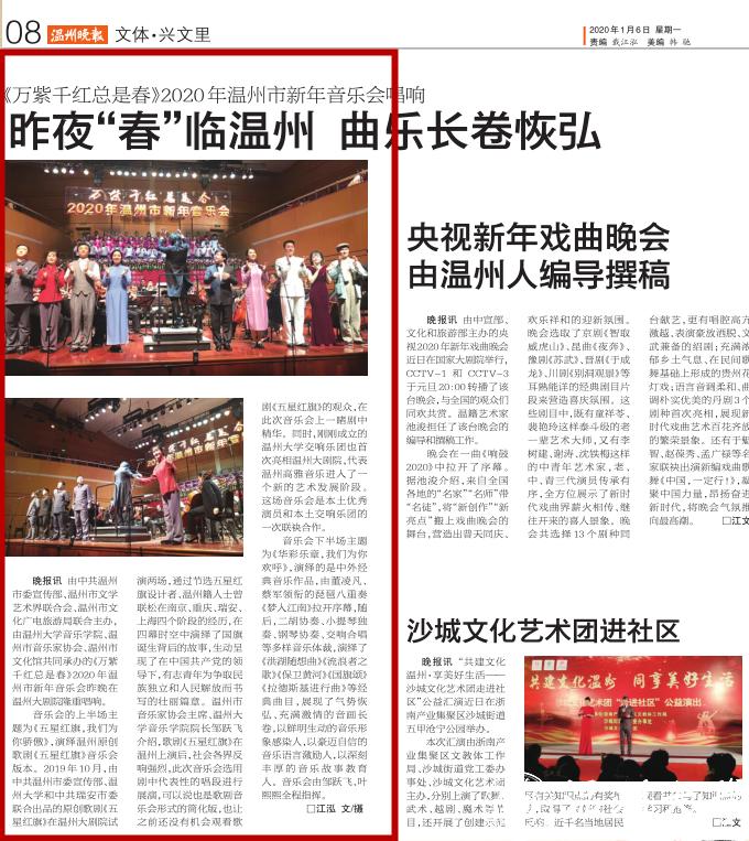 晚报讯由中共温州市委宣传部、温州市文学艺术界联合会、温州市文化广电旅游局联合主办,由日本色情片 音乐学院、温州市音乐家协会、温州市文化馆共同承办的《万紫千红总是春》2020年温州市新年音乐会昨晚在温州大剧院隆重唱响。