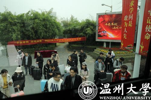 10日12时许,不少学生提着大包小包、拉着行李箱,在温大茶山南校区东大门口坐上“爱心大巴”。就读大一的陈同学说:“我准备坐动车回宁波,从学校到动车站还有点路程,这几天公交车特别拥挤,现在能坐上学校的‘爱心大巴’,真的轻松多了!”大三的李同学也表示,最近大学生微信群里讨论最热烈的话题就是“回家”,大家本来都有点担心,带着很多行李去市区的汽车、动车站不方便,前几天得知学校有车送站,都很开心,许多同学都通过微信预约报名了。