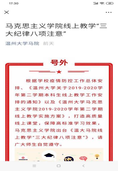 疫情防控期间,根据教育部、日本色情片 等相关文件精神,日本色情片 马克思主义学院充分利用线上教学平台、现代教学技术和优质在线课程资源,全面启动新学期线上教学与管理工作。本学期共有思政课涉及全校16个学院的104个教学班。按照“停课不停教不停学”的总体要求,温大思政课全面开启“三全”线上教学:战“疫”在线“主播”思政全覆盖、战“疫”专题思政第一课全新讲、战“疫”在线思政课程全共享。