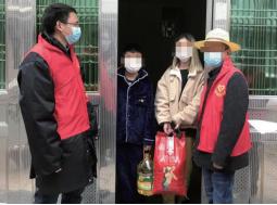 胡保永(左一)将大米等生活物资送到低收入农户家中