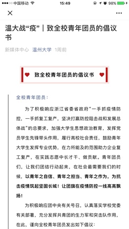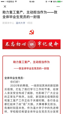 学校组织部发出“助力复工复产,主动担当作为——致全体毕业生党员的一封信”。信中说:“大事难事见担当,危难时刻显本色”,作为温大学子中的先进榜样,学校殷切希望全体毕业生党员充分发挥引领作用,主动担当作为,让党旗在防控疫情和企业复工复产第一线高高飘扬!