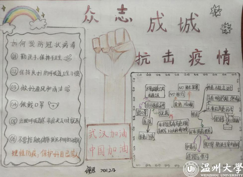外国语学院、电气与电子工程学院的同学都以自己的角度对“怎么做好疫情防控”展开讨论、分享感悟;化材学院用手绘画的方式展示了疫情防控的关键点;生环学院以问答方式重点讲述了几个疫情相关的关键点;计算机与人工智能学院不仅普及了此次新型冠状病毒的预防知识,叮嘱同班同学出门戴口罩,科学防护、理性应对;同时要求全体同学在“温大易班”APP上完成疫情相关知识的学习,完成考试。