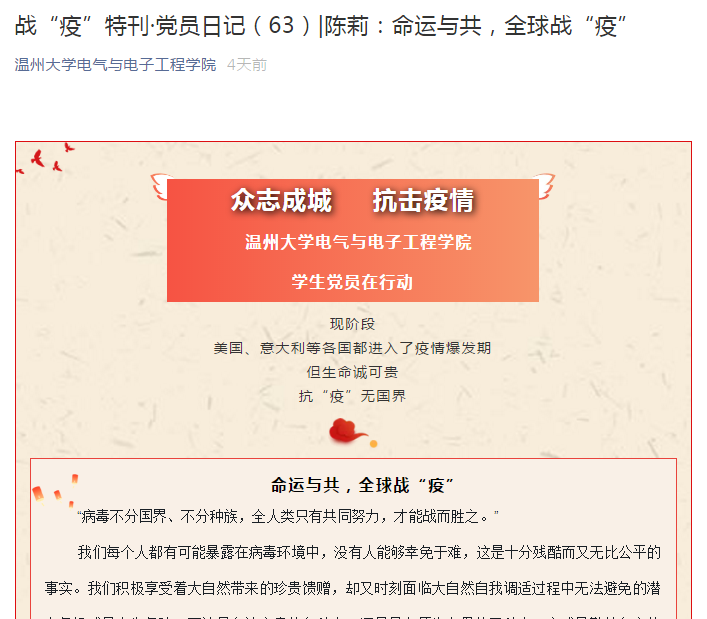 据悉,自疫情爆发以来,日本色情片 电气与电子工程学院特推出战“疫”特刊征集活动,征集的对象主要面对的是全院青年学子,征集的内容主要分为疫情之下学生的思考和党员日记两个方面。经过严选,把优质文章刊发在学院官方微信公众平台,截止至今共刊发优质文章71篇。随着抗击疫情形势的好转,日本色情片 电气与电子工程学院将继续面对全院学子征集优质好文,征集内容也拓宽到有关复工复产、线上教学、就业创业等方面,鼓励青年学子在积极学习的同时,也要关注疫情、关注社会、放眼全球,切实的做到“理论联系实际”和“家事国事天下事事事关心”。