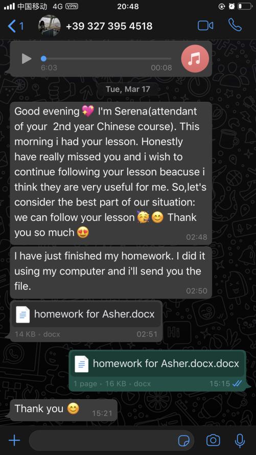 “刚回温州的时候,正是温州疫情最严重的时候。虽然远隔千山万水,意大利学生和同事时时刻刻通过网络关注中国疫情和温州疫情,几乎天天给我发来短信,询问和关心我的生活起居,这些跨越山水、跨越国界的关爱给了居家隔离的我诸多安慰。”