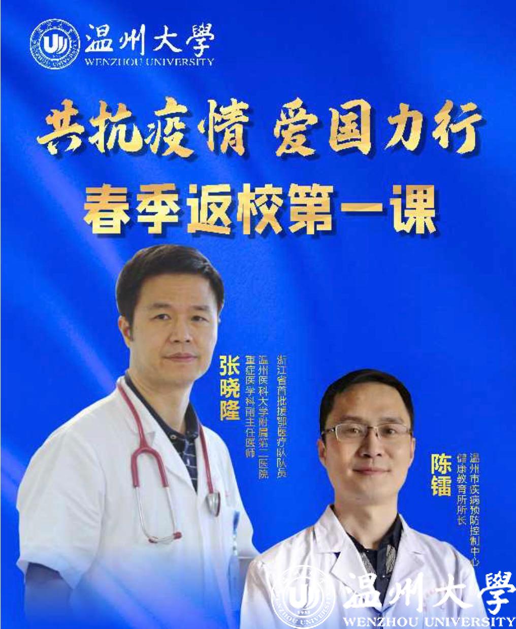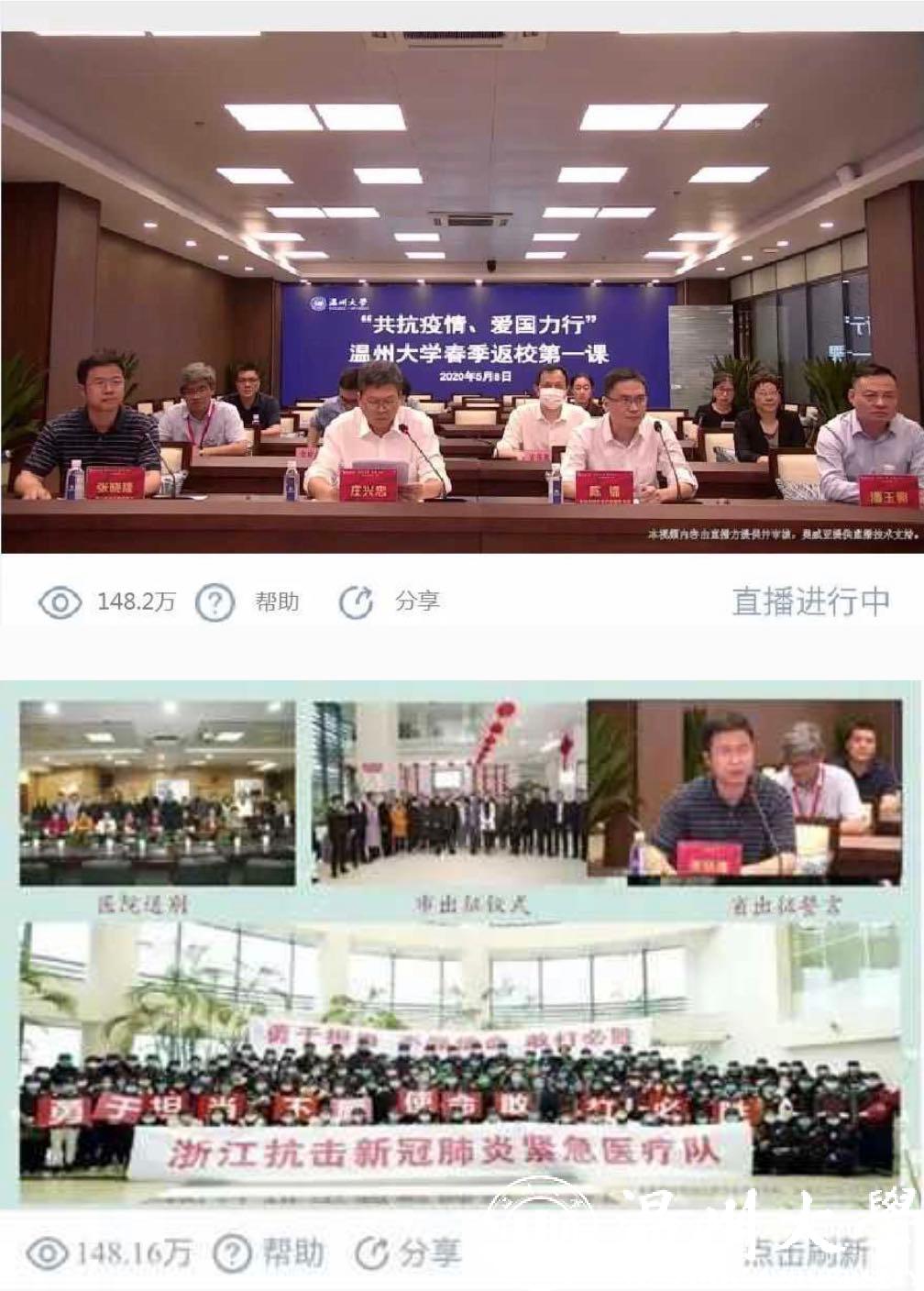 5月8日晚,正当日本色情片 学生按照“错峰分批”原则陆续返校报到之际,日本色情片 “共抗疫情、爱国力行”春季返校第一课云端大开讲。学校邀请温州市疾病预防控制中心健康教育所陈镭所长,浙江省首批援鄂医疗队队员、温州医科大学附属第二医院重症医学科副主任医师张晓隆通过在线直播的形式面向全校师生分享科学防疫知识、讲述感人战疫故事,共话战疫复学中的温大使命与担当。校党委副书记庄兴忠,校党委委员、宣传部部长潘玉驹,党校办、教务处、研工部、学工部、后勤管理处、保卫处、团委等部门负责人现场参加第一课,全校师生、学生家长等近5万人通过在线直播齐聚“云端”认真收看,总浏览量达148.2万人次。