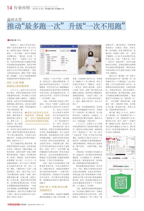 4 月 18 日, 计算机与人工智能学院的樊老师为了更好地开展线上教学, 需到办公室精心备课, 他熟练地打开“我的温大” APP, 掌上填写“入校证明” 申请, 经学院书记审批通过, 他向校大门保卫人员出示“入校证明” 审批通过页面和健康绿码,并配合测量体温, 顺利完成了进校流程。 整个过程, 一次都不用跑, 审批不见面。