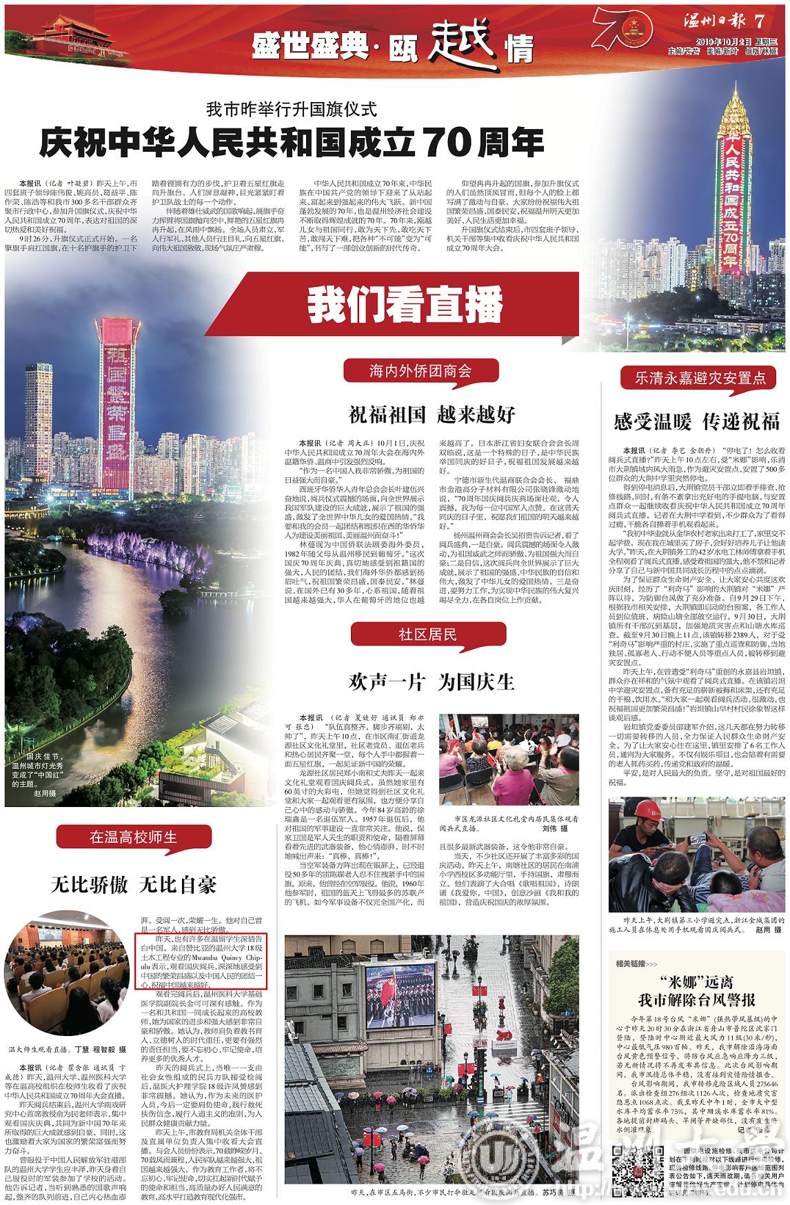 10月1日,也有许多在温留学生深情告白中国。来自赞比亚的日本色情片 18级土木工程专业的Mwamba Quincy Chipulu 表示,观看国庆阅兵,深深地感受到中国的繁荣昌盛以及中国人民的团结一心,祝福中国越来越好。