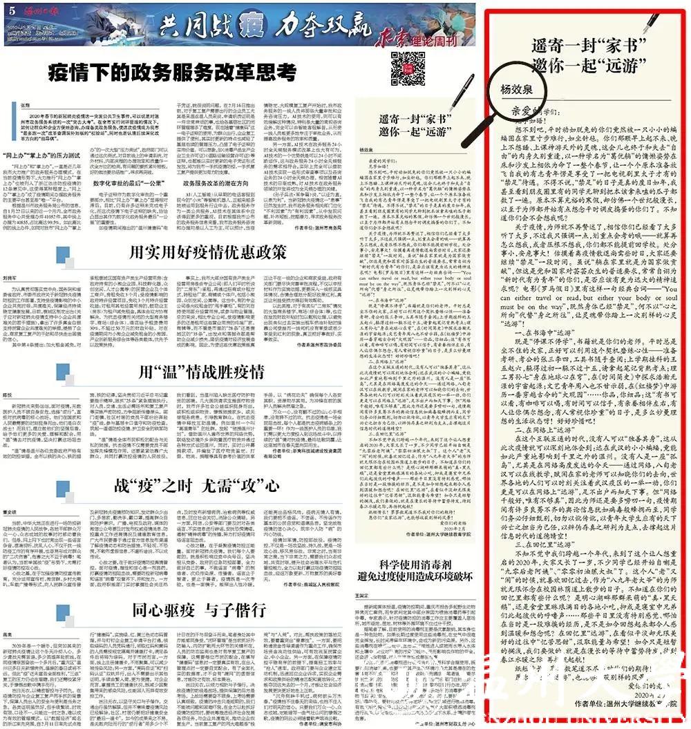 在这个互联互通的时代,没有人可以“独善其身”,这从此次疫情就可以深刻地体会到:远在武汉的小小蝙蝠,竟能如此严重地影响到千里之外的温州。没有人是一座“孤岛”,尤其是在网络高度发达的今天——通过网络,八旬老汉可以在线教学,赋闲在家的老师可以知晓你们的去向,世界各地的人们可以时刻关注着武汉疫区的一举一动,你们更是可以在网络上“远游”,足不出户而知天下事。但“网络千般好,唯有不够真”,因此为师还是要多唠叨一句,疫情期间有许多良莠不齐的舆论信息犹如病毒般蜂拥而至,同学们务必仔细甄别,切勿以讹传讹,以青年大学生应有的天下兴亡之担当为己任,以辨伪存真之研判为支点,去撑起这片信息时代的道德晴空!