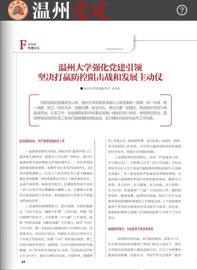 二是发挥先锋作用,积极担当作为。一个党员就是一面旗帜,学校广大师生党员通过实际行动,让党旗在疫情防控和学校发展一线高高飘扬。依托学科专业背景,学校党员教师撰写的《关于改进基层卡点防疫工作的建议》《关于做好防控疫情下逐步恢复企业生产的建议》《精准扶持出口企业加强复工生产指导》等20多篇咨政建言上报中办、中国侨联和省、市政府部门。师生党员积极响应党中央号召,开展自愿捐款支持新冠肺炎疫情防控工作,累计捐款26万余元,捐款比例100%。据统计,全校1100多名师生党员投入疫情防控工作,其中152名师生党员从事一线疫情防控工作,320名师生党员参加疫情防控志愿服务活动。学校1个基层党组织和2名教师党员分别获市委组织部和市教育局通报表扬。