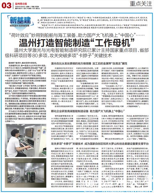 目前,该研究院围绕激光装备产业链在激光器、光路调制系统、扫描系统等“卡脖子”关键技术,与行业龙头企业进行产学研合作攻关——联合奔腾激光攻克万瓦超高功率激光切割难题,打破国外技术垄断;研发的机器人激光在线测微与分选系统现已全面应用于三星机电、万宏集团、百岸科技等产品的质量检测与分选;联合久恒光电研发的纳米颗粒/金属陶瓷激光复合涂层技术已在金属硬密封球阀、火电站闸阀和离心泵关键运行密封组件上获得应用。