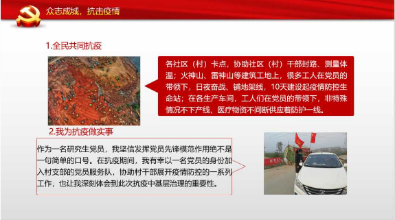来自本科生党支部的入党积极分子许媛媛从一位老支书讲起,分享了他在全面建成小康之路上的艰辛付出,讲述了共产党员的责任担当。在此基础上,他看到了一批批抗疫先锋在抗疫阻击战中的身影,尤其是一个个温大人的力量,彰显着“求学问是、敢为人先”的温大精神。