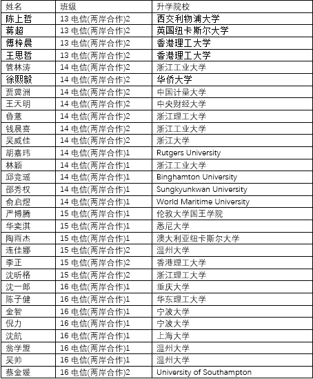 加强学生就业指导,就业前景好,范围广,专业相关性高,薪酬高,2017届~2019届毕业生一次就业率都达到100%。主要的就业去向:公务员,杭州海康威视数字技术股份有限公司,浙江大华技术股份有限公司,中国移动温州分公司,中国联通温州分公司,中国电信杭州、宁波、温州分公司,海尔集团,国家电网台州供电公司等。