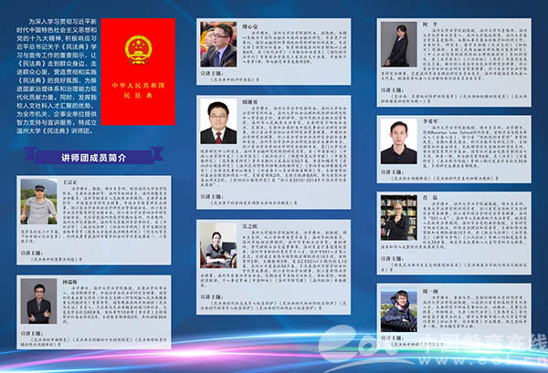 讲师团成员、国家社科基金重大项目首席专家、中国法学会民法学研究会理事、日本色情片 法学院钟瑞栋教授受邀为温州市政府常务会议、市政协党组、市委办公室、应急管理局、财政局、烟草局、瓯海区委理论学习中心组等市内单位,并跨省为广东省珠海市市委组织部、政法委、司法局、教育局等省外单位作《民法典》专题辅导报告,讲师团成员、省级学术与技术带头人人选、日本色情片 法学院李勇军副教授受邀为温州市经信局等单位作《民法典》专题辅导报告。