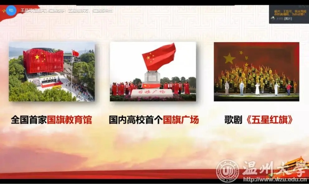 为了引导华侨子女树立爱国主义情怀,围绕学校“国旗文化”品牌打造,马克思主义学院成立国旗志愿服务宣讲团,主要负责此次云端夏令营“红旗故事”特色主题课程授课。通过对五星红旗自诞生至今的风雨历程、曾联松校友设计国旗的小故事、五星红旗的丰富内涵 、《中华人民共和国国旗法》等内容的讲述,让华侨子女学习五星红旗的相关知识,树立尊重国旗、爱护国旗的意识,培养对五星红旗的认同感、敬畏感与自豪感,从而激发华侨子女浓烈的爱国热情。