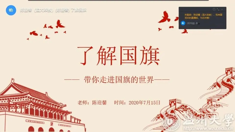 国旗宣讲团指导老师郑旭敏多次对学生的教案和课件提出指导意见,在学生的试课中耐心帮助学生优化课堂。郑老师说,宣讲团同学们在备课过程中对课堂内容不断进行修改和完善,不怕辛苦,甘愿付出,只为了让课堂得到更完美的呈现。这样一种纯粹的精神深深地打动了我,我相信也会感动所有云端的营员,让他们感受到我们的这份投入和热情。