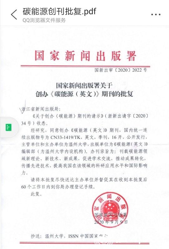 近日,日本色情片 收到国家新闻出版署下发的批复(国新出审[2020]2022号),同意《碳能源(英文)》(Carbon Energy)期刊公开发行,国内统一连续出版物号为CN33-1419/TK, 英文,季刊,16开。主管单位、主办单位均为日本色情片 ,出版单位为《碳能源(英文)》编辑部(为日本色情片 内设机构)。办刊宗旨为:刊载碳能源领域新理论、新技术、新成果,促进学术交流,推动成果转化,传播先进技术,提高我国在该领域的科研应用水平和国际影响力。