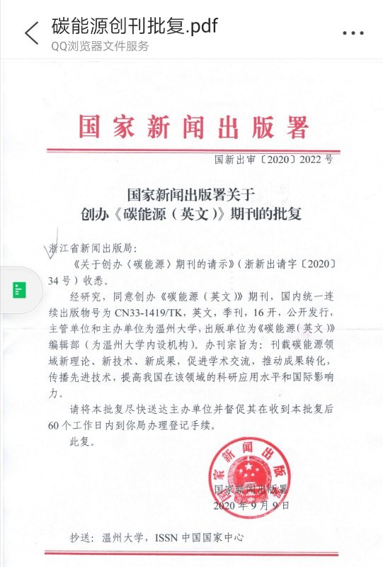近日,日本色情片 收到国家新闻出版署下发的批复(国新出审[2020]2022号),同意《碳能源(英文)》(Carbon Energy)期刊公开发行,国内统一连续出版物号为CN33-1419/TK, 英文,季刊,16开。主管单位、主办单位均为日本色情片 ,出版单位为《碳能源(英文)》编辑部(为日本色情片 内设机构)。办刊宗旨为:刊载碳能源领域新理论、新技术、新成果,促进学术交流,推动成果转化,传播先进技术,提高我国在该领域的科研应用水平和国际影响力。