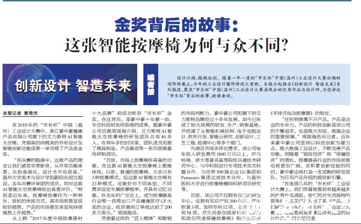 在2019年的“市长杯”中国(温州)工业设计大赛中,浙江豪中豪健康产品有限公司旗下的艾力斯特AI智能太空椅,凭借其时尚精美的外形设计及智能创新功能成果一举夺得了产品类金奖。
