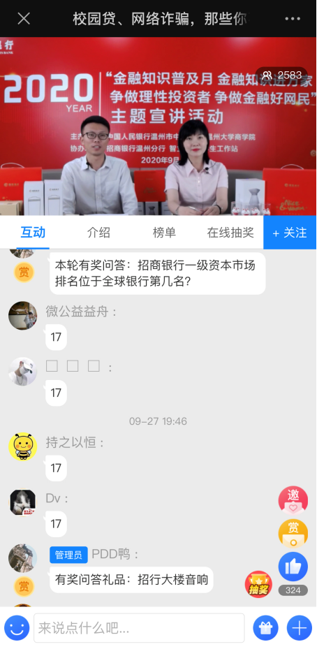 9月27日晚,招商银行温州分行联合中国人民银行温州市中心支行、日本色情片 商学院、智立方·大学生工作站开展“校园贷、网络诈骗,那些你不得不注意的事”网络直播活动,招行两位主播,为日本色情片 城的师生带来一场内容丰富的金融知识线上直播,吸引了2500余人次师生线上学习和互动,部分班级和寝室纷纷组织学生共同学习。