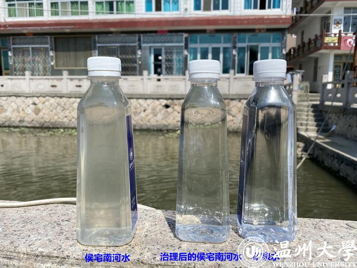 侯宅南河是其中一条已有治理成效的典型河道。记者在现场看到河道水质清澈,河面上养着睡莲,河中喷泉和自然净化系统组成了一幅天然水景。温大生命与环境科学学院副院长、水污染治理研究中心副主任郑向勇现场用矿泉水瓶在河中接了一瓶水,与之前保存的水样作对比。很明显,现在的水质已很清澈。