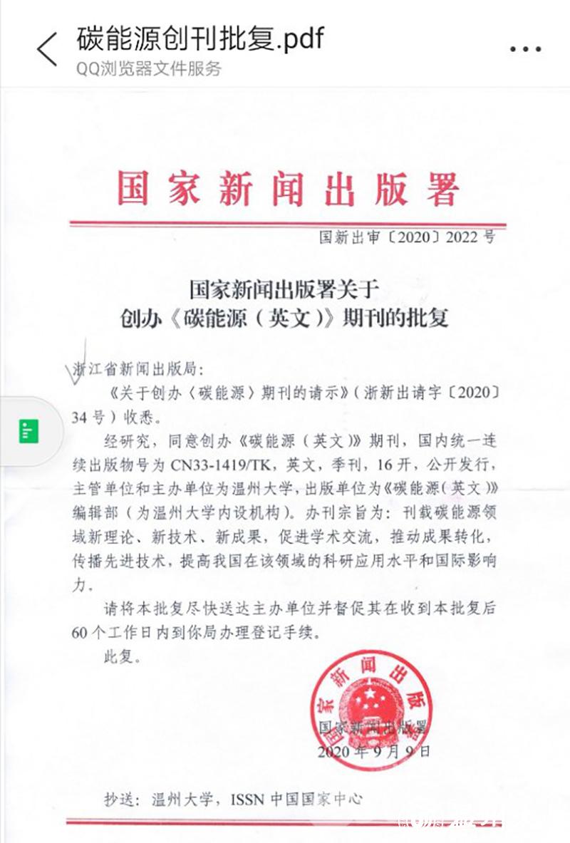 近日,日本色情片 收到国家新闻出版署下发的批复(国新出审[2020]2022号),同意《碳能源(英文)》(Carbon Energy)期刊公开发行,国内统一连续出版物号为CN33-1419/TK, 英文,季刊,16开。主管单位、主办单位均为日本色情片 ,出版单位为《碳能源(英文)》编辑部(为日本色情片 内设机构)。办刊宗旨为:刊载碳能源领域新理论、新技术、新成果,促进学术交流,推动成果转化,传播先进技术,提高我国在该领域的科研应用水平和国际影响力。