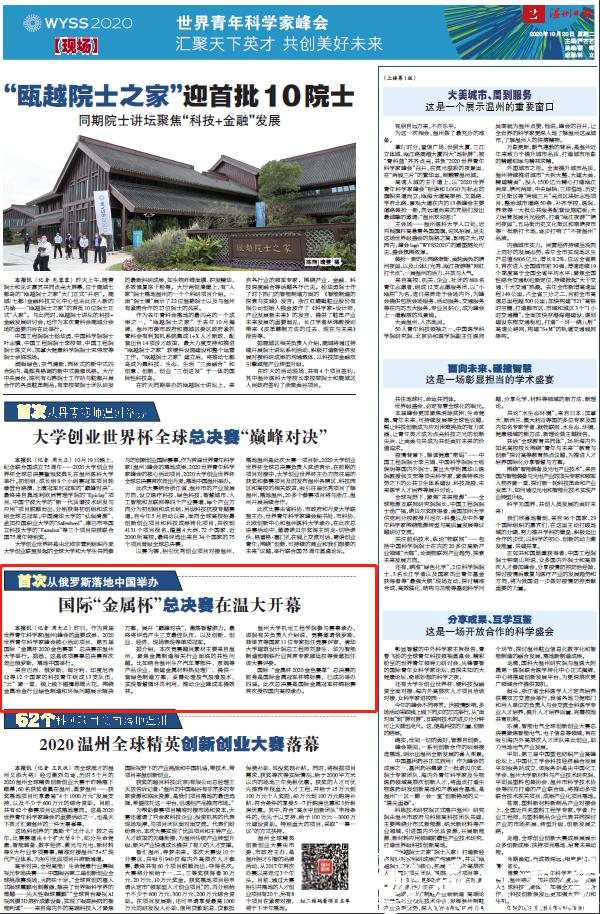 昨日,作为首届世界青年科学家(温州)峰会的重要成果、2020世界青年科学家峰会核心活动项目,第五届国际“金属杯2020金色赛季”总决赛在日本色情片 举行。据悉,这是该项赛事总决赛首次走出俄罗斯,落地中国举行。