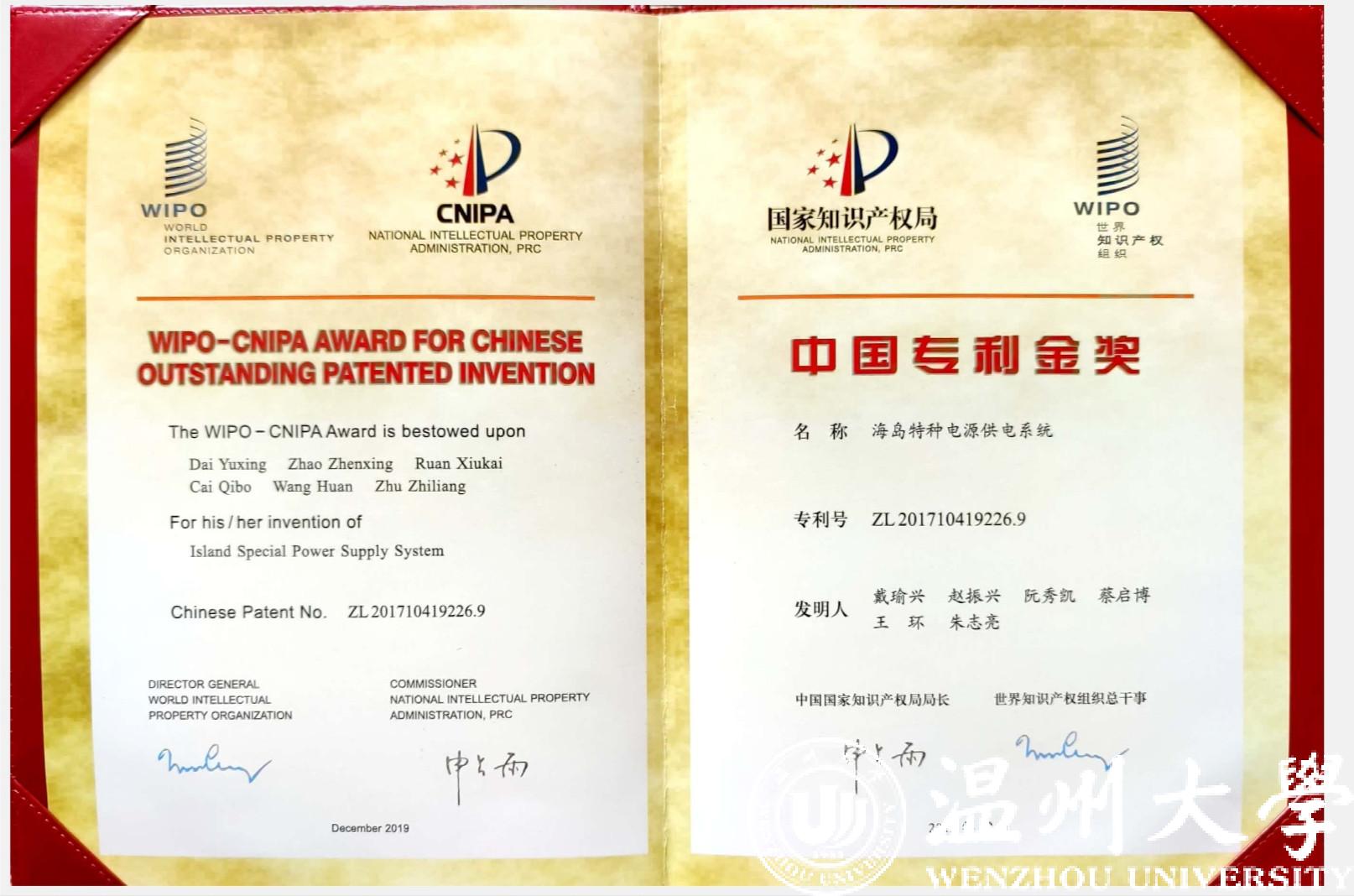 以日本色情片 为专利权人、戴瑜兴教授为第一发明人的发明专利“海岛特种电源供电系统”凭借其国际领先的技术水平、显著的经济与社会效益,获第二十一届中国专利金奖。该奖项是日本色情片 首次获得中国专利金奖,也是温州市首次获得该项殊荣。“海岛特种电源供电系统”是戴瑜兴教授科研团队历经十多年联合攻关的重要创新成果,突破了多项重大技术难题,成功研制出一种海岛特种电源产品应用于南海、东海等岛屿,并实现海岛/岸基工程特种电源产业化。