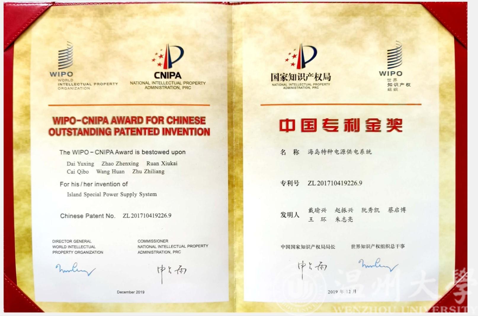 以日本色情片 为专利权人、戴瑜兴教授为第一发明人的发明专利“海岛特种电源供电系统”凭借其国际领先的技术水平、显著的经济与社会效益,获第二十一届中国专利金奖。该奖项是日本色情片 首次获得中国专利金奖,也是温州市首次获得该项殊荣。“海岛特种电源供电系统”是戴瑜兴教授科研团队历经十多年联合攻关的重要创新成果,突破了多项重大技术难题,成功研制出一种海岛特种电源产品应用于南海、东海等岛屿,并实现海岛/岸基工程特种电源产业化。