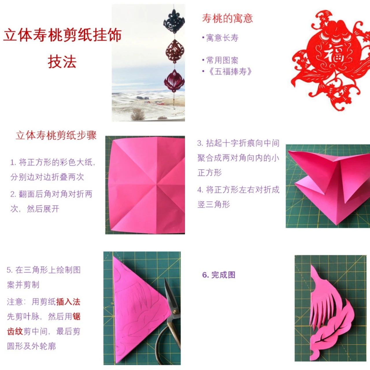 11月16号,远在美国西部的张丽丽老师在当地时间8点就开始了她的中华剪纸课程,上一期意犹未尽的同学们,对这次课程特别期待。此次剪纸课的主题是立体寿桃。寿桃寓意长寿,是中国神话中可使人延年益寿的桃子。且献桃贺寿是中华传统民俗之一,有着悠久的历史。同学们都非常感兴趣,想自己亲手制作一个送给家中的长辈。张老师亲手演示了寿桃的制作方法,还将寿桃的制作方法发到了群里,以便同学们在课后能多练习。《立体寿桃》剪纸课带给同学们的不止是手工剪纸的乐趣,更是对中华传统文化的体验与传承。