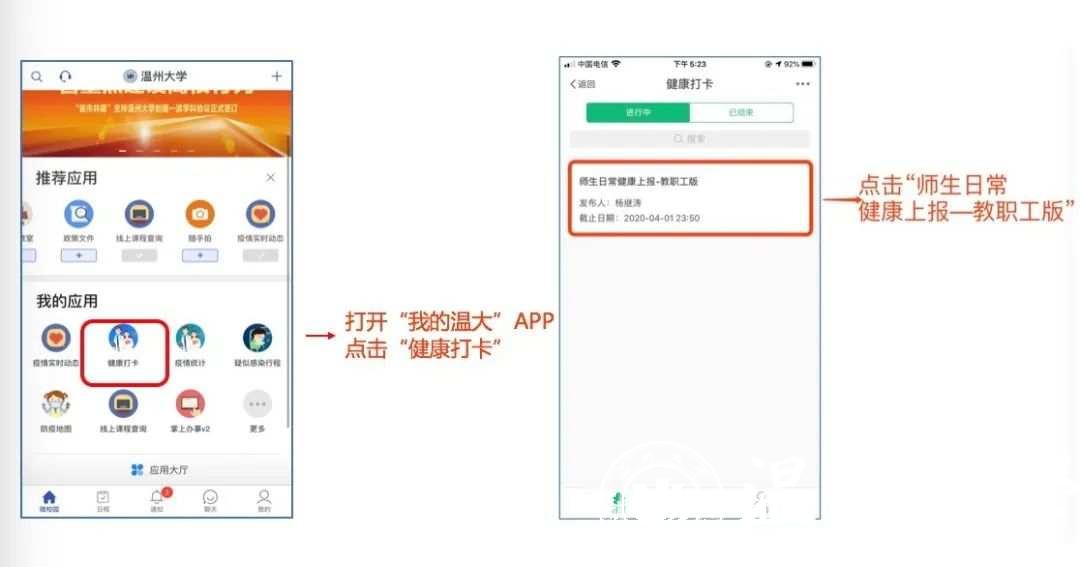 1.根据每日报送要求,锐捷将“健康打卡”整合到“我的温大”APP 中,避免了师生在手机终端再次安装程序,多应用、多账户、多入口的烦恼,争取上线时间。