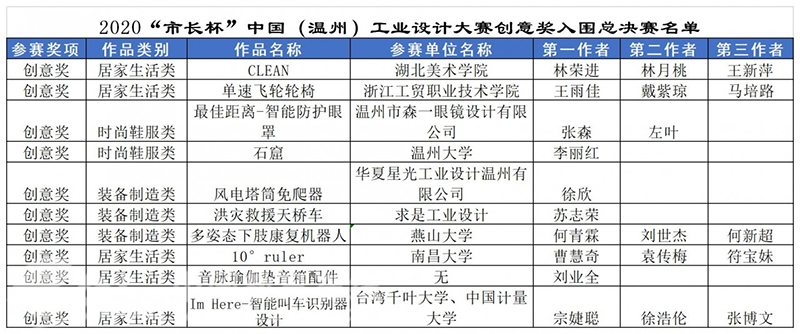 据悉,此次入围决赛的18件作品,将在2020年“市长杯”中国(温州)工业设计大赛的官网进行公示(//wzszb.66wz.com/),并于11月份下旬举办总决赛路演及颁奖典礼。