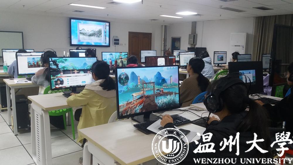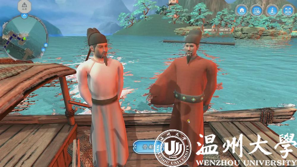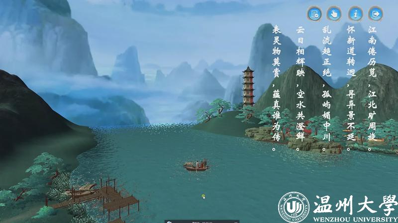 今年11月,《山水诗之意境体验虚拟仿真实验教学项目》被正式认定为国家级虚拟仿真实验教学一流课程,是全国首批文学类的虚拟仿真实验教学项目,也是浙江省唯一的文学类虚拟仿真实验教学课程。2017年9月,该项目正式在温大人文学院上线试课,创新教学模式,深受学生欢迎。温州作为山水诗发源地,研发团队将此作为教学项目主题,学生可选取山水诗鼻祖谢灵运、山水诗代表诗人孟浩然、文天祥等文人作为虚拟仿真实验中的特定角色,以江心屿作为特色地标。在技术渲染的手段下,学生可以在充满意境的虚拟仿真环境中沉浸式地学习古典诗词,真正达到在自主学习过程中掌握系统化知识的目的。
