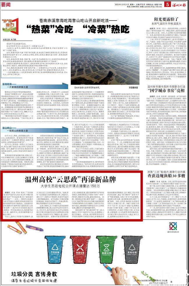 记者了解到,为了打破学生对思政课堂 深奥难懂的印象,真正认识并运用马克思主 义,今年5月,我市创新打造大学生思政电 视公开课,结合温州历史文化和经济社会发 展实践,引导青年学生了解温州、爱上温州、 创业创新在温州。该课由市委宣传部全程 主导,对课程设置、嘉宾选择等环节严格指 导把关,使每堂思政公开课在“有料”“有味” 的同时,确保导向正确,避免泛娱乐化。如 第一期思政公开课,聚焦“战疫”——温医大 以《从“战疫”看中国之治》为题,把疫情防控 中的鲜活素材作为生动教材,引领学生在抗 疫中成长,深刻感悟中国特色社会主义制度 优势,激发学生的爱国爱乡情怀。