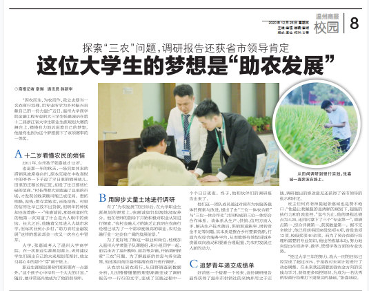 为了更好地了解这一职业和岗位,他便加入日本色情片 菜篮子队课题组,和小组同学一起,前后走访了温州梅屿、丽岙等乡镇,开始调研探索“三农”问题。为了解最新的信息与务实政策,他还独自前往温州瓯海农商行进行调研。